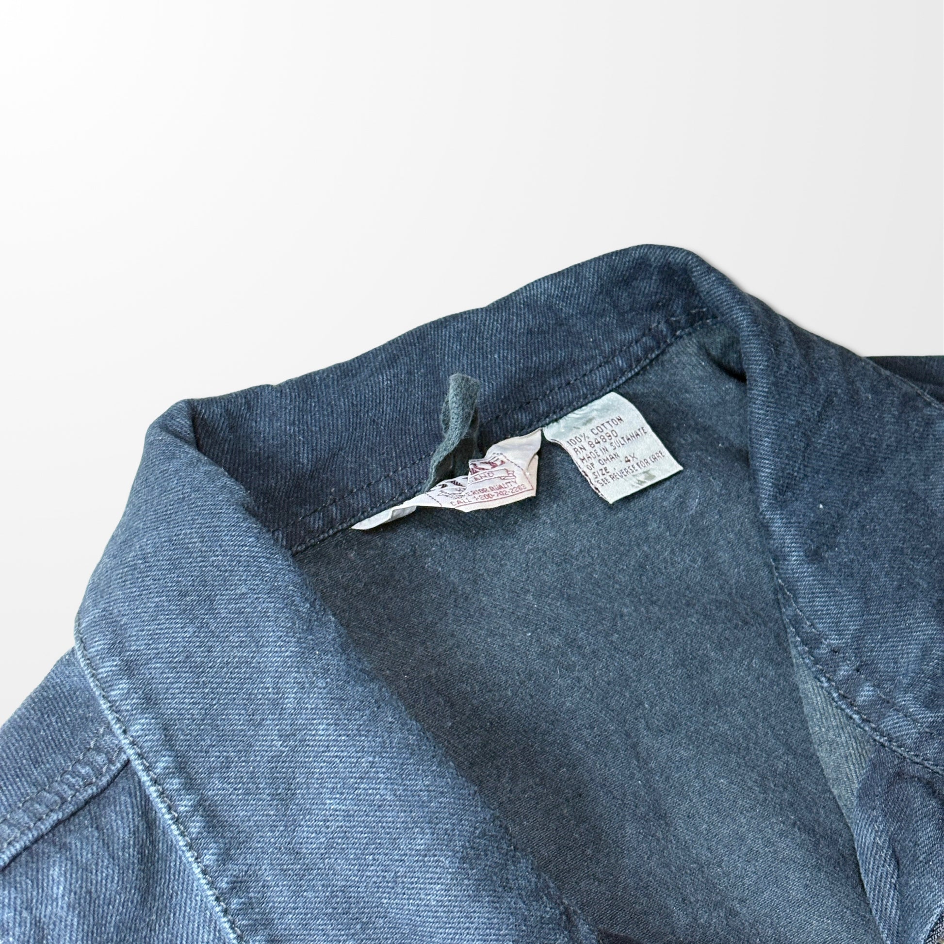 洗いをかけたような深いネイビーは、光の加減で柔らかな陰影を生み、静かに存在感を放ちます。現行品ではなかなか出会えない、経年によって増す風合いも魅力のひとつ。