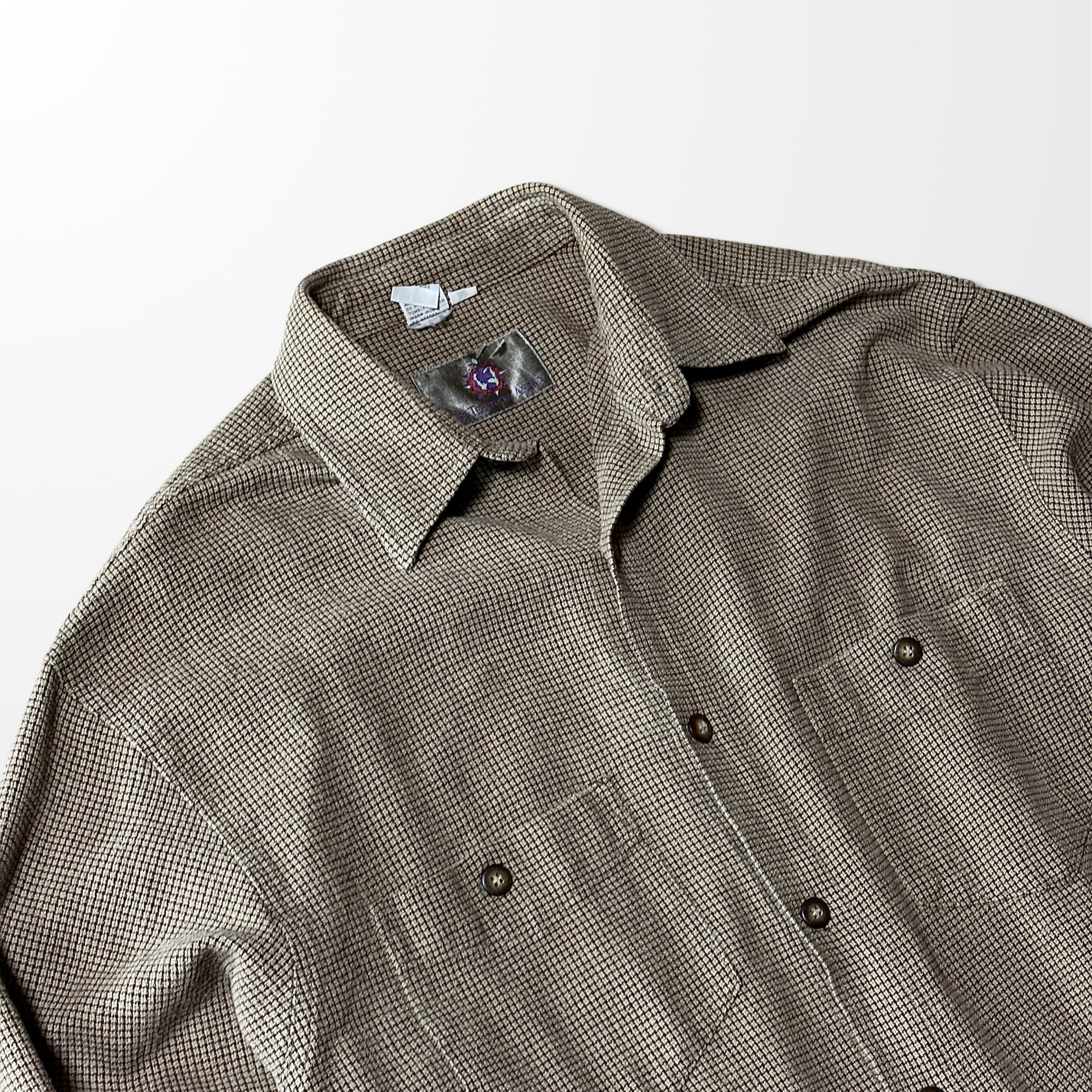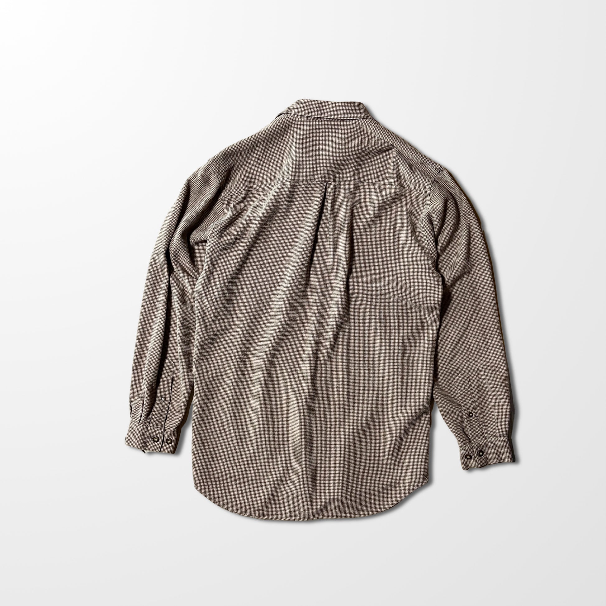 落ち着いたブラウンをベースにしたミニチェックが、派手さを抑えつつも存在感を放ちます。胸にはポケットを2つ配し、ワークシャツらしい実用性と程よい無骨さを備えています。