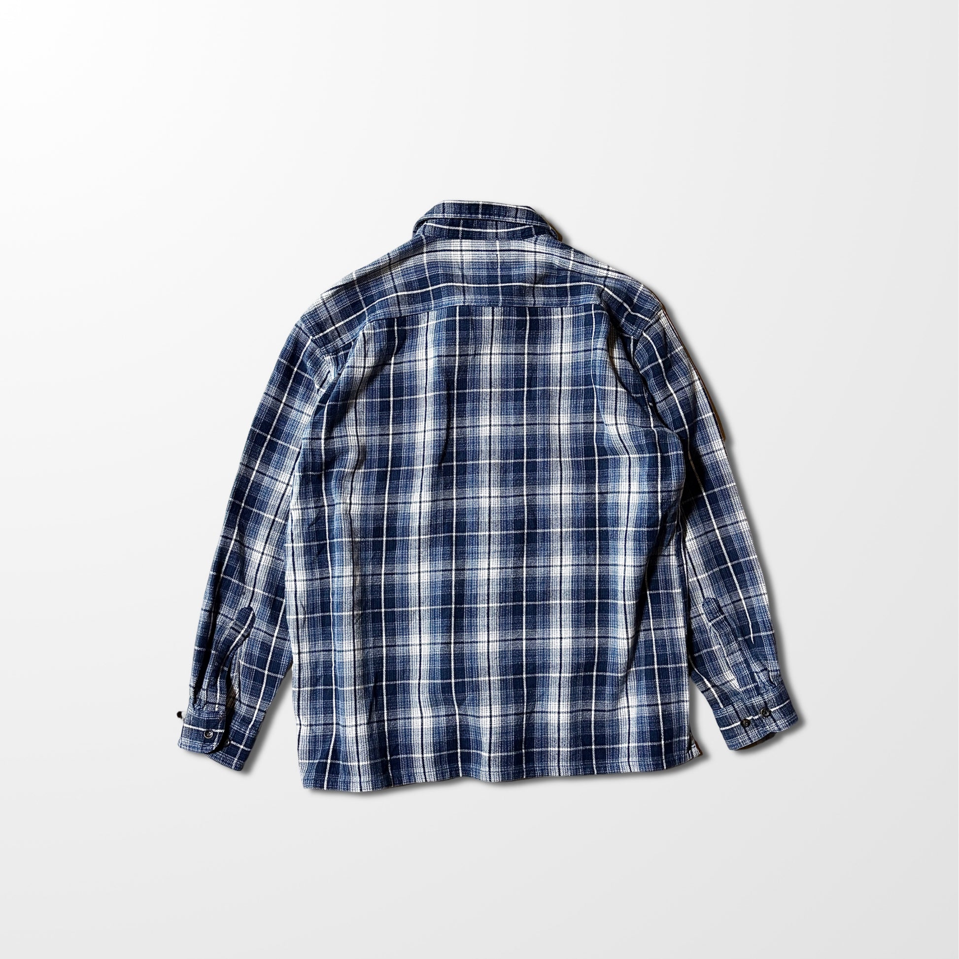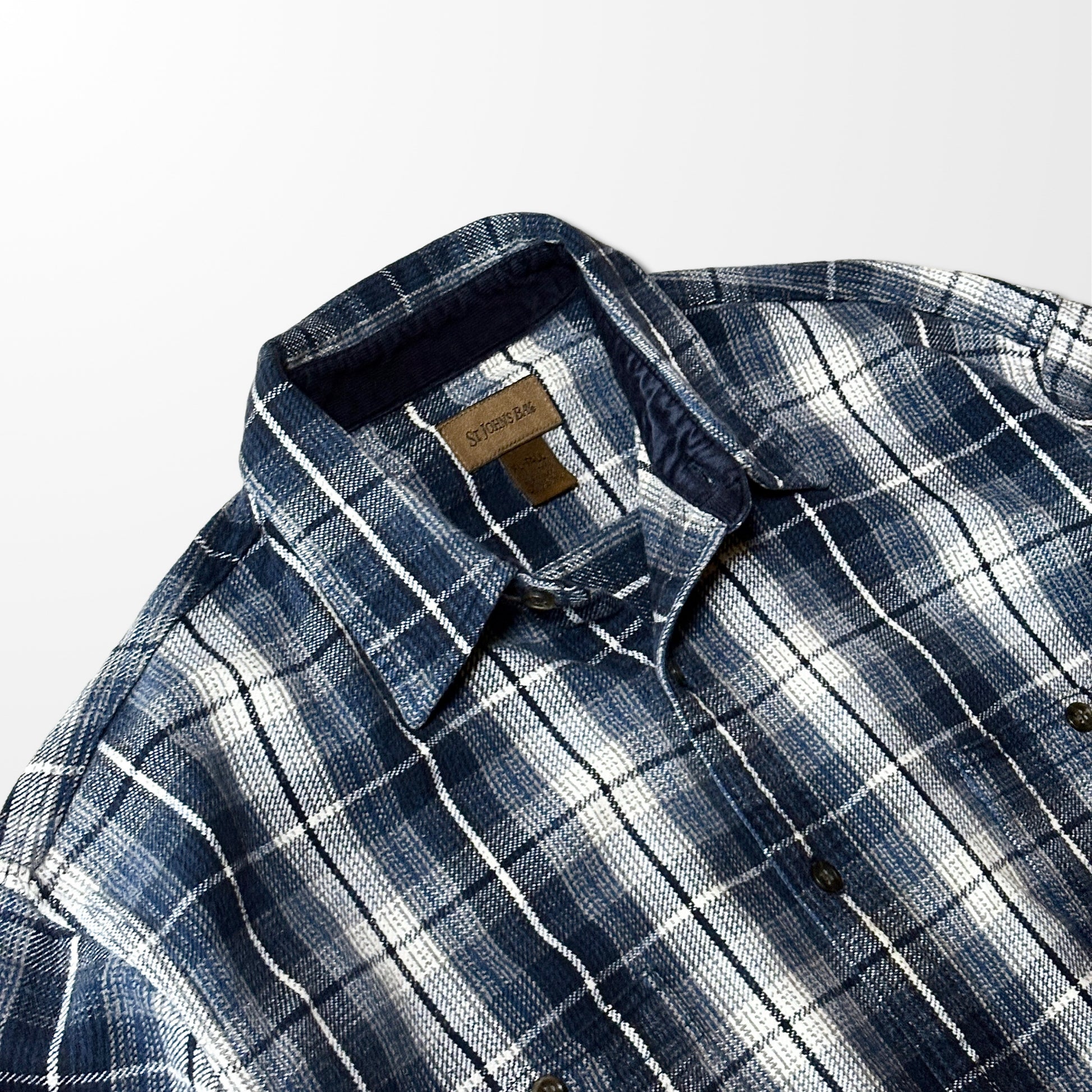 程よくフェード感のあるブルーチェックが印象的な、St. John’s Bay のフランネルシャツ。ペンキ飛びもナイス。XLサイズならではの余白を残したシルエットが、羽織るだけで大人の余裕を感じさせます。