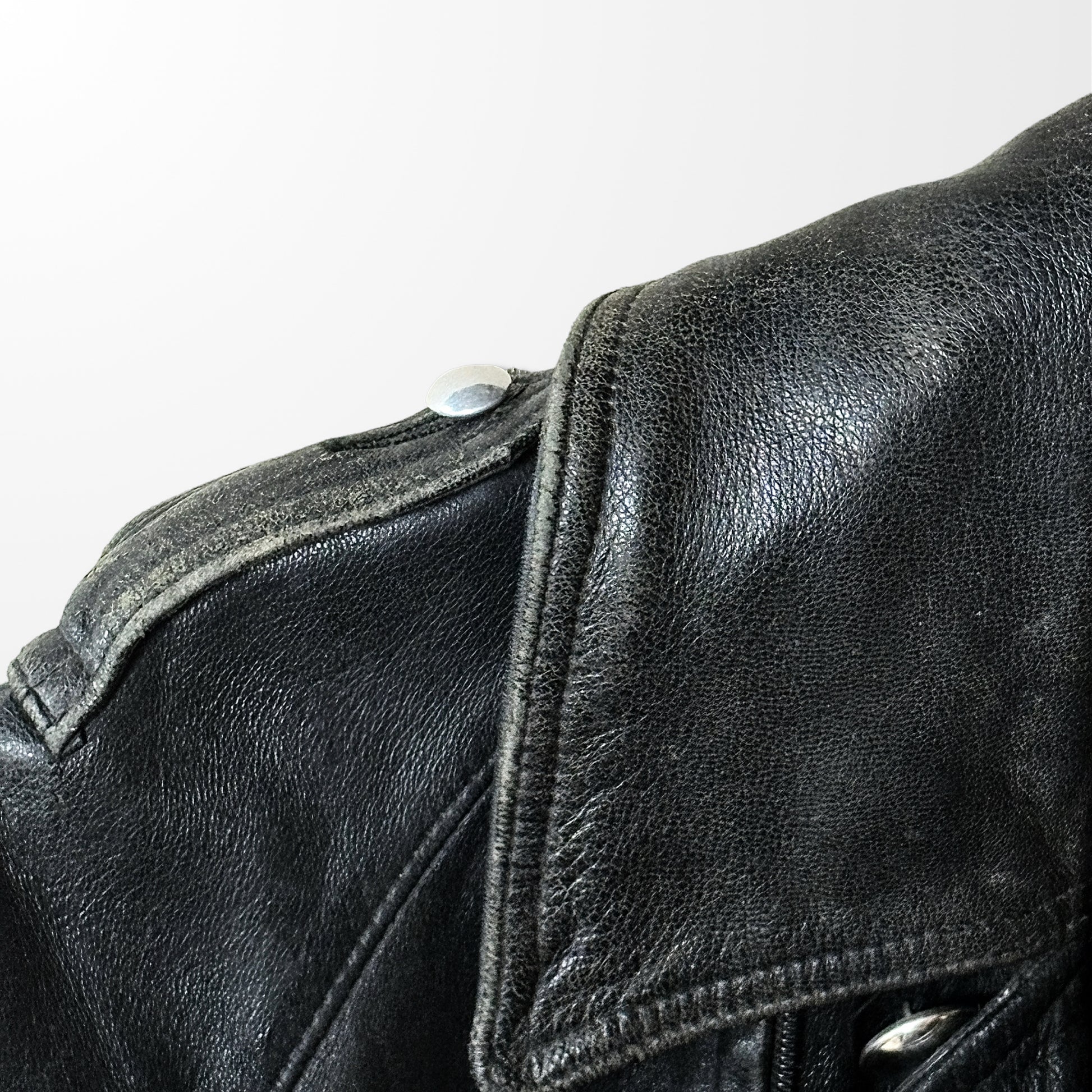 柔らかくもしっかりとした本革を贅沢に使い、ダブルブレストのフロントやエポーレット、ウエスト切替のステッチが軍モノらしい存在感を際立たせます。