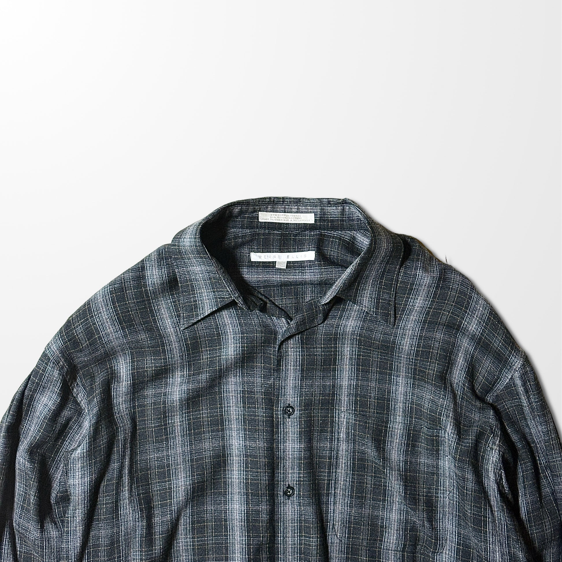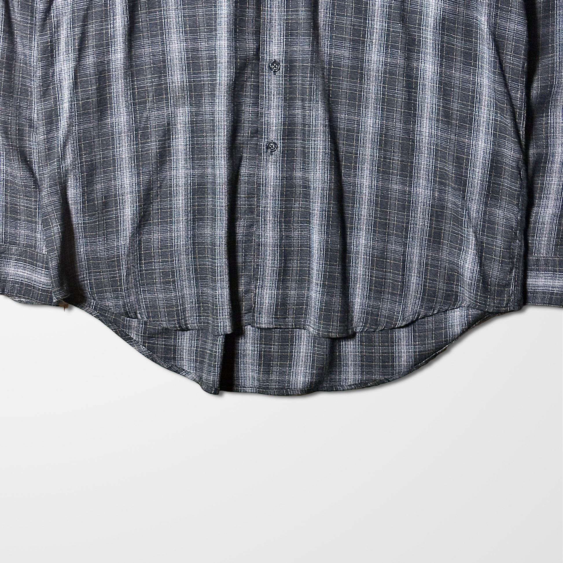 ペリーエリスの長袖チェックシャツ。55%コットンと45%レーヨンを掛け合わせた生地は、軽やかさとしなやかさを兼ね備え、肌触りは柔らかくとろみのある質感です。光の加減で表情を変えるグレートーンのチェック柄は、派手すぎず静かに映える佇まい。