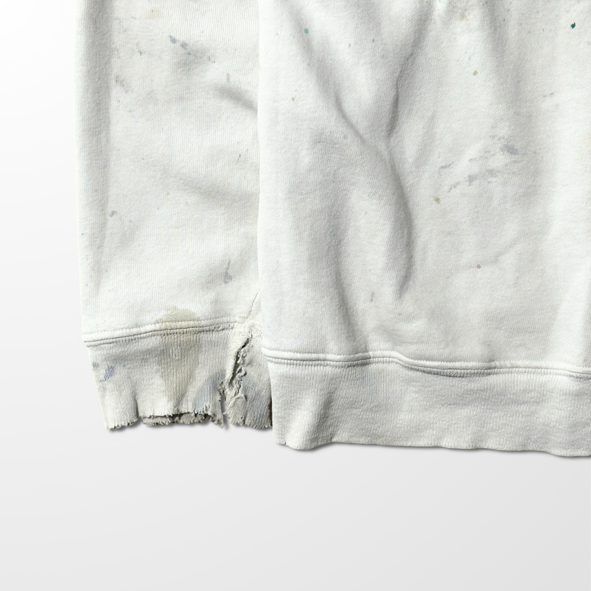 ホワイトボディに施された大きなロゴプリントが印象的。袖口や裾のダメージ、ペイント跡、色移りなど、長い年月を経たヴィンテージ特有の風合いがしっかりと感じられます。