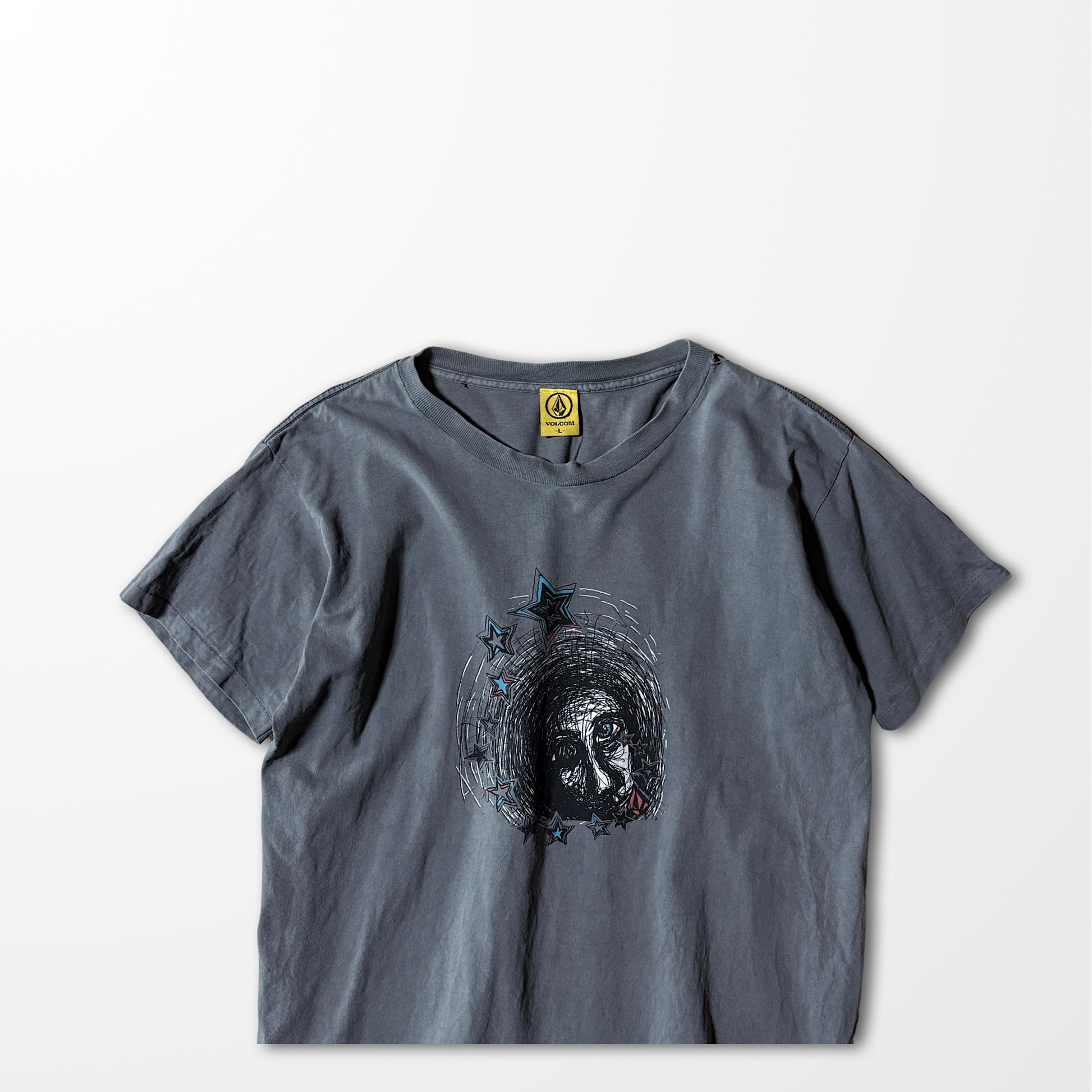 Faded Art Print T-shirt / abstract face & stars / charcoal gray