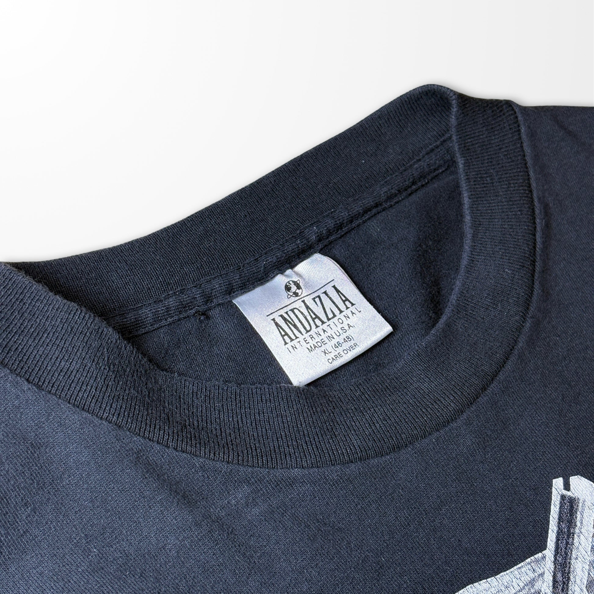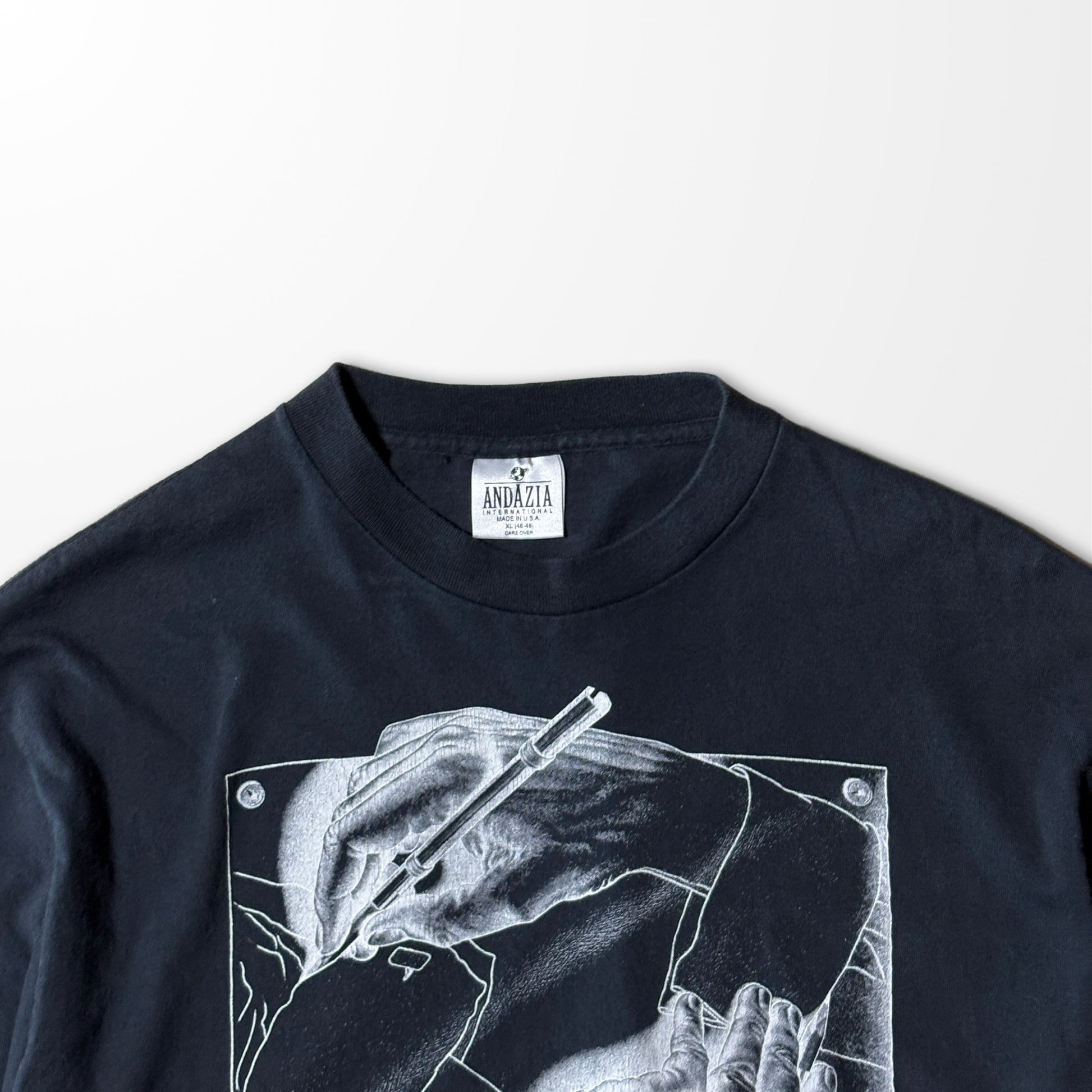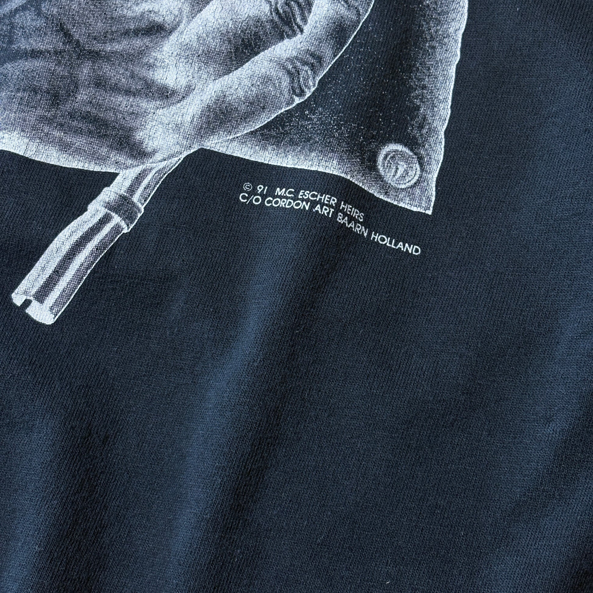モードな雰囲気と知的なユーモアが絶妙にミックスされた一枚。 エッシャーの有名な「Drawing Hands」をフロントに大胆プリント。 抽象的なアートが主役になることで、シンプルなコーディネートでもしっかり個性を出せます。 少し色褪せたブラックボディが大人の余裕と深みをプラス。アートやデザインが好きな方、コーデにちょっとした“語れるポイント”を求める人におすすめです。 ヴィンテージTシャツとしての人気も高く、今後も価格の高騰が予想される一枚です。 状態がいいものを長く着てフェードを楽しみたい方にもおすすめです。