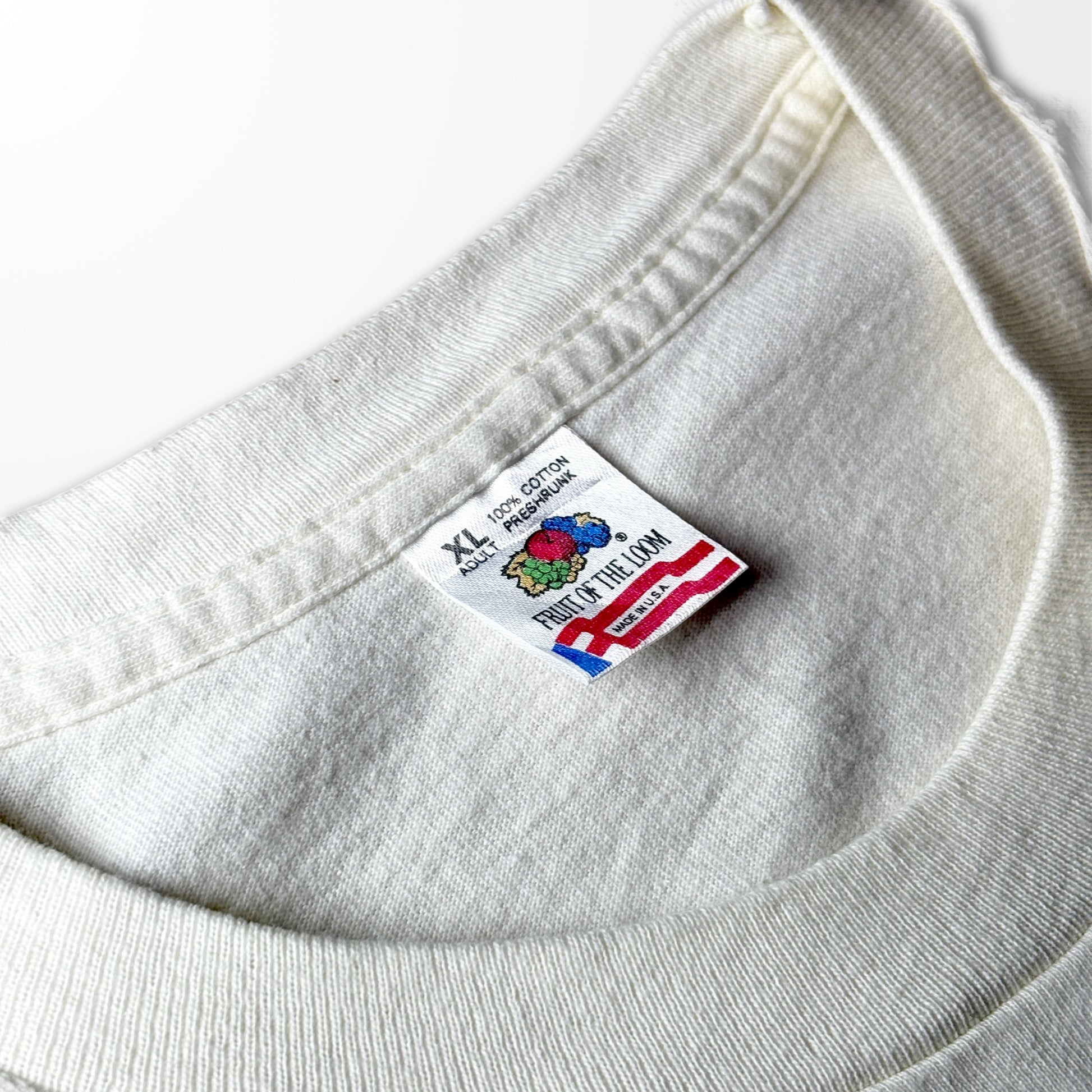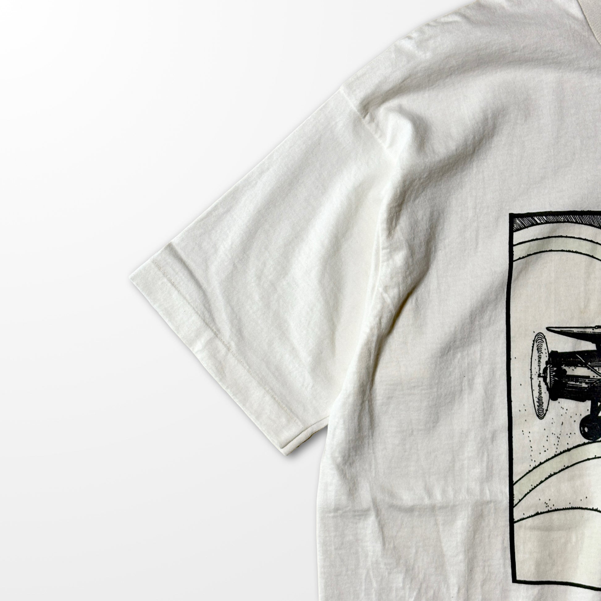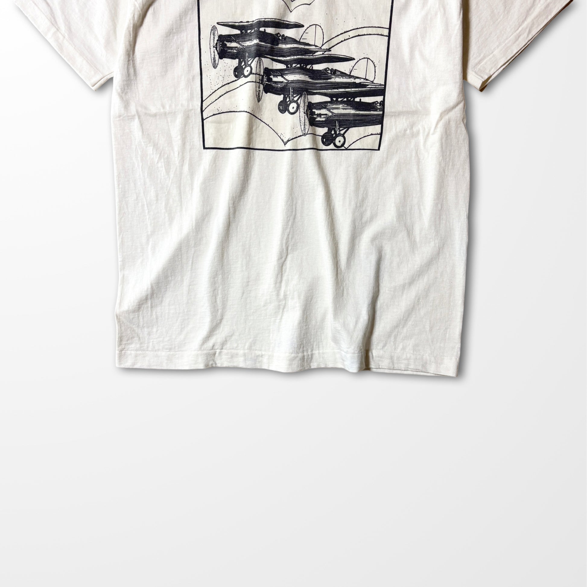 クラシックな飛行機の線画プリントが印象的な一枚。シンプルだけどアート感あるデザインで、着るだけで雰囲気がぐっと大人っぽくなります。程よくフェードしたホワイトボディと、控えめなプリントのバランスも絶妙。さらっと一枚で着ても、インナー使いにも映える万能なTシャツです。