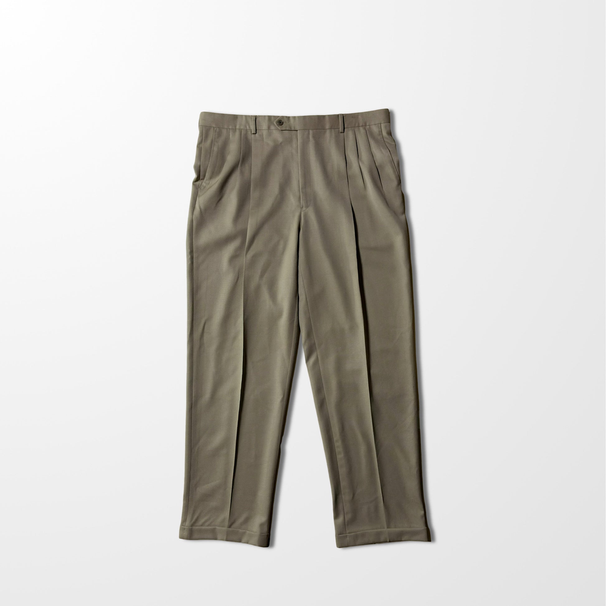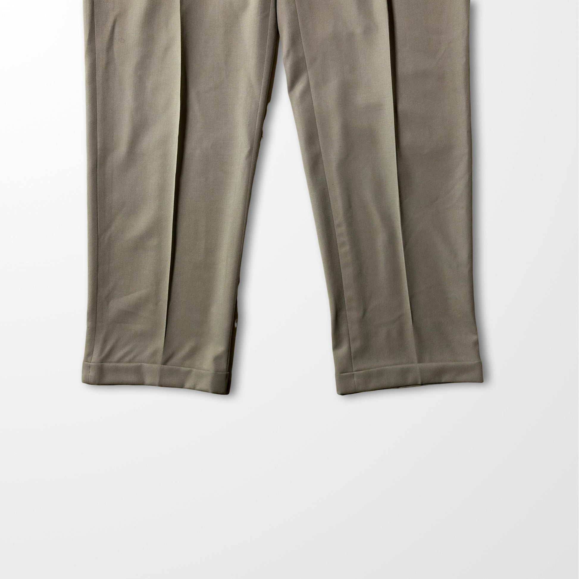 柔らかなベージュにほんのりカーキが混じる絶妙な色合い。90年代ジバンシィらしいスリータック仕様が、腰回りから美しいドレープを生みます。深めのタックとワイドなシルエット、やや太めのベルトループや滑らかな裏地など、細部まで抜かりない作り込み。