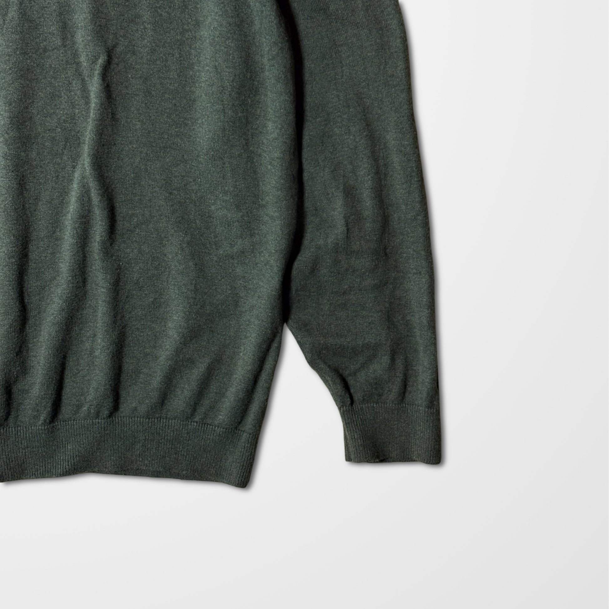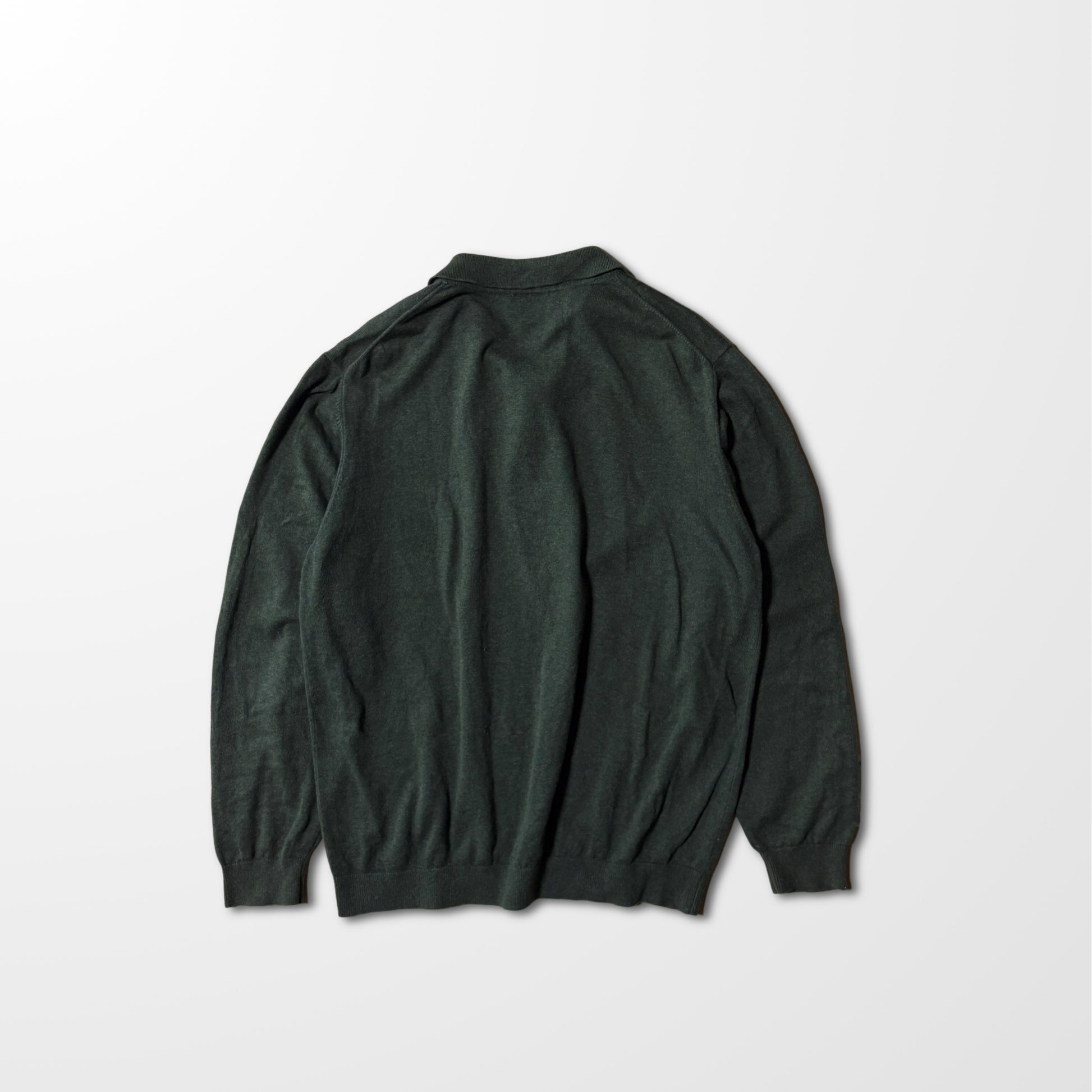 襟付きのプルオーバー型は、シャツのようなきちんと感とニットのリラックス感をバランス良く両立。深みのあるグリーンは派手さを抑えつつ、光の加減で柔らかな陰影を生み、シンプルなのに絵になる存在感を纏います。