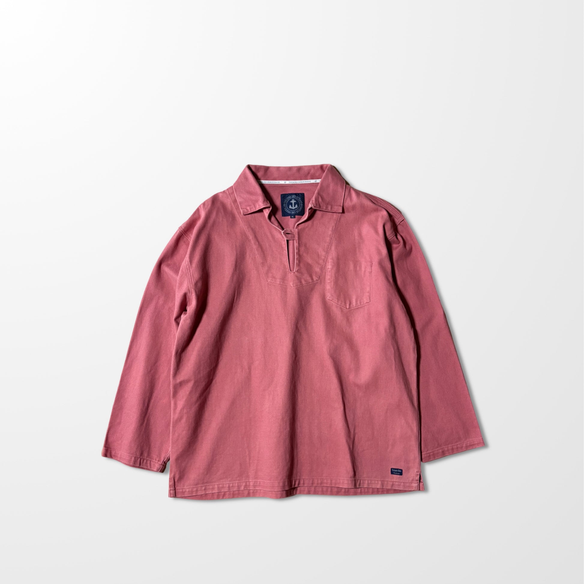 クラシックなプルオーバー型に、鮮やかすぎず落ち着いた発色のピンクが映える一枚です。